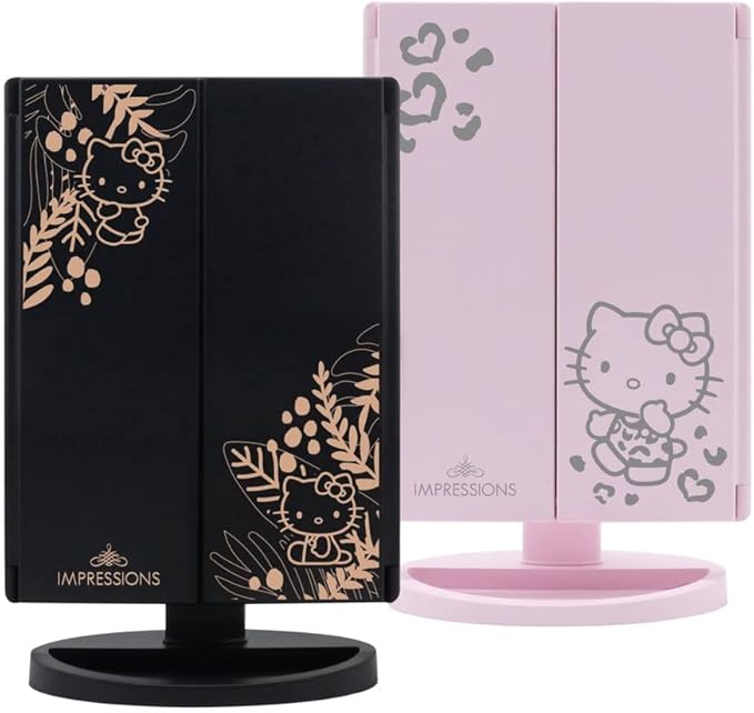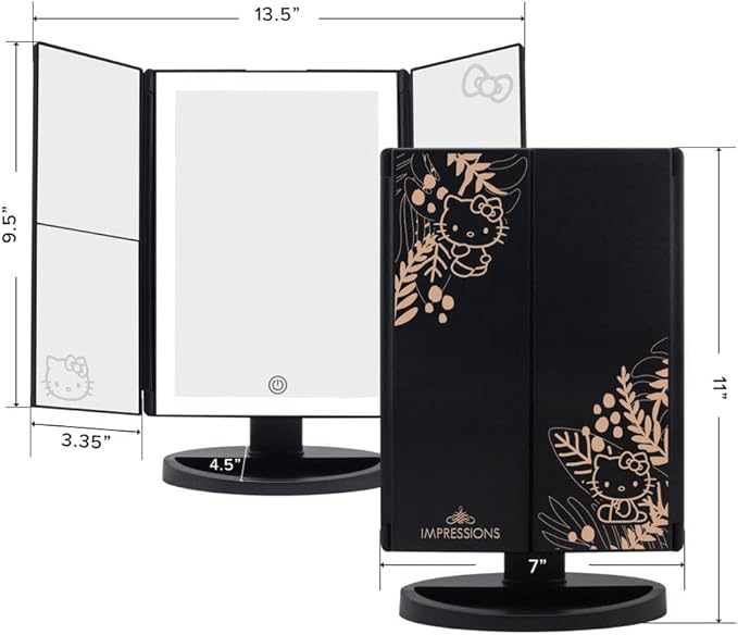 Impressions Vanity Hello Kitty Mirror with Lights, Trifold LED Tri Tone Makeup Mirror with Touch Sensor and Three Adjustable Mirror Panels, Handheld Magnifying Makeup Mirror (Black)