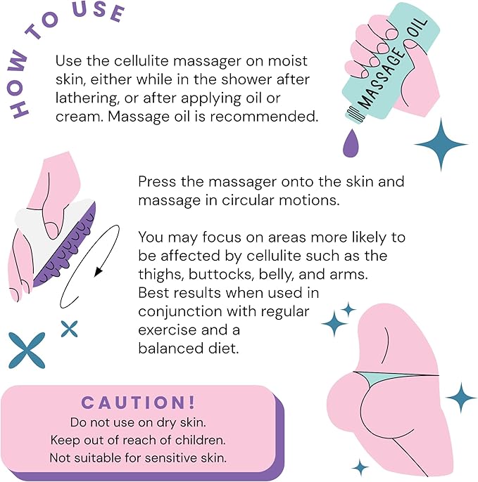 - Anti-Cellulite: Works best in conjunction with a healthy diet and plenty of exercise. You'll begin to lose cellulite pockets on your thighs and buttocks. Use the massager with anti-cellulite oil for smooth rubbing & application. Face massager, back and body exfoliator. Silicone body scrubber is great for all parts of the body. Apply pressure as necessary with oil. #1 exfoliating brush body brush on the market!