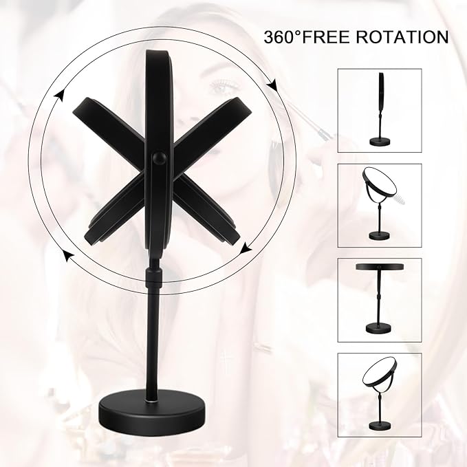 - 【360°Rotation freestanding makeup mirror】Easy to change the mirror face between double sides makeup mirror(1x and 5x sides), and can fix firmly at any angle as your need. The dual sided magnifying mirror enables to adjust to any proper angle to see your face clearly for different people.