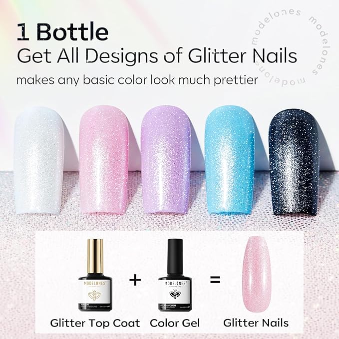 - Upgrade Glitter Finish: Modelones 2024 New Glitter Top Coat Gel with Sheer Aurora Micro Glitter ; In the static, is a little white pearlescent exquisite glitter color , in the dynamic and from different angles it shows aurora dust iridescent dreamy effect colors (Check out our video).