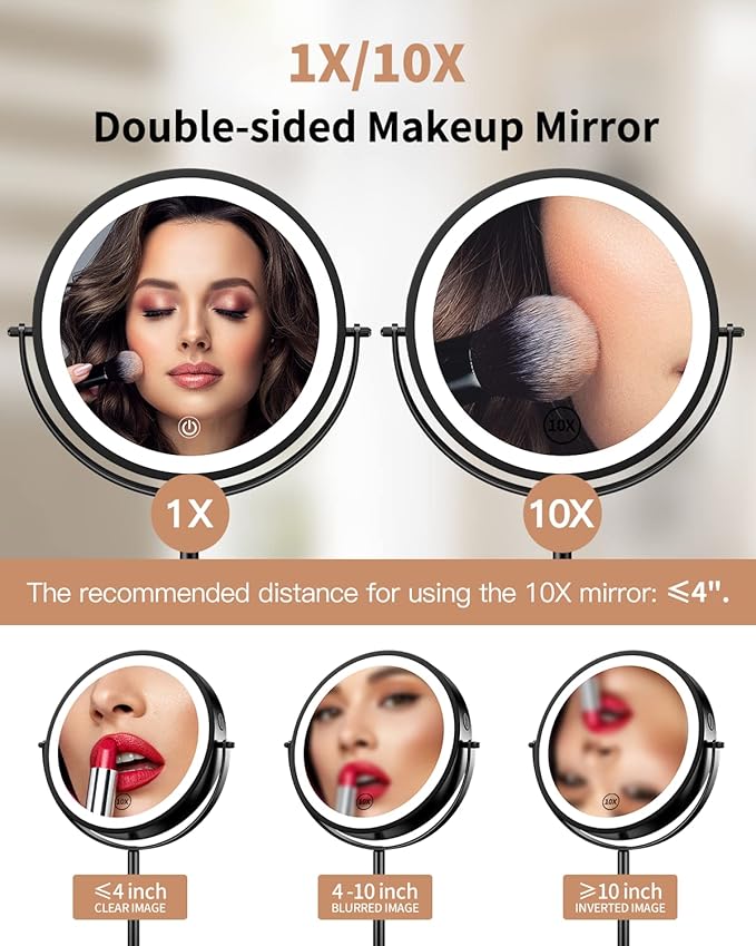 - 【DUAL-SIDED 1X/10X MAGNIFICATION】 - This vanity mirror is double-sided design, the 1X magnification side is suitable for daily use. The 10X magnification side is suitable for detailed makeup and daily skin care (such as wearing contact lenses, plucking eyebrows, shaving, facial care or applying mascara etc.)