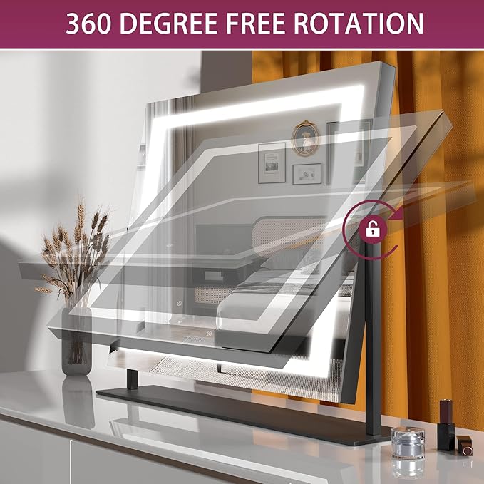 Hasipu Vanity Mirror with Lights, 24.2" x 19.7" LED Makeup Mirror, Light up Mirror with 10X Magnification, Smart Touch 3 Colors Dimmable, 360° Rotation (Right Angle Black)