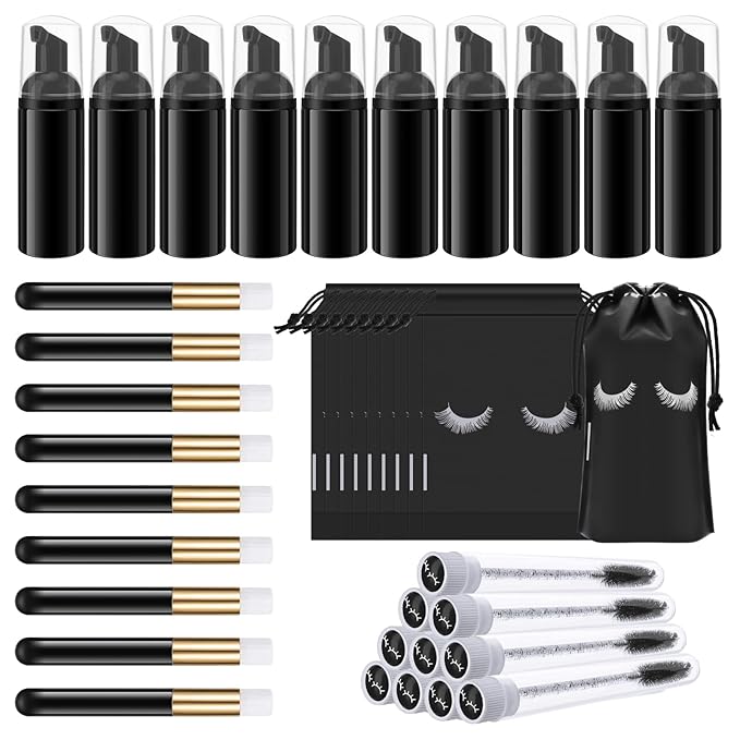 Homicozy 40 Pcs Lash Shampoo Bottle Brushes & Dispensers Set - 10 Pcs Lash Brushes, Tubes & Aftercare Bag for Clients, Women, Girls (Black)
