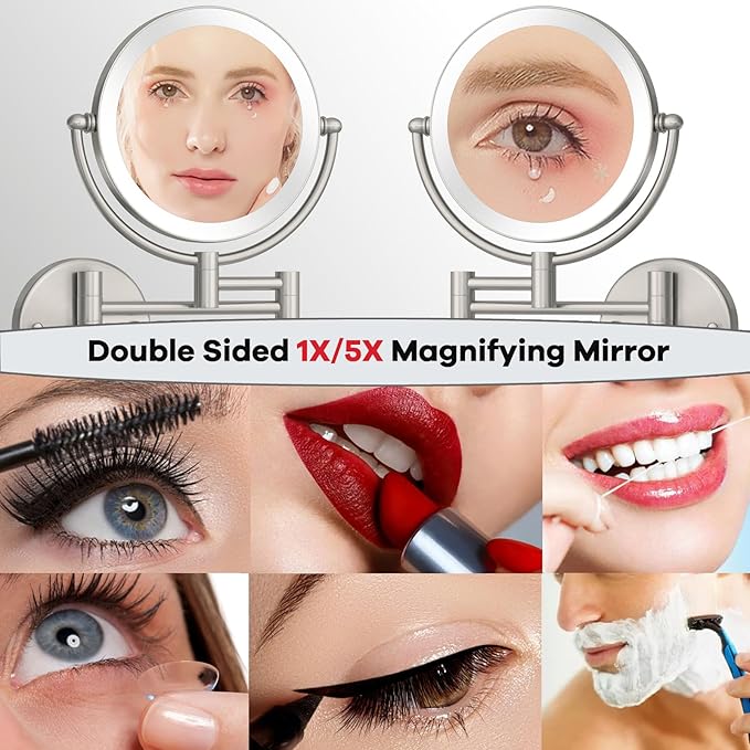 - High-Quality Brass Material: The material of the wall-mounted makeup mirror mainly is brass, which can adapt to the humid environment of the bathroom for a long time without corroding. It has 42 diffuse LED lights and the most suitable magnification for makeup, 5x magnification