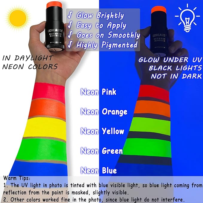 - 💗GLOW UNDER UV/BLACK LIGHTS - Glows brightly under UV and black lights and shows vibrant colors in Day laight, they will make you shine and dazzling in the dark. Easy-to-wash and smooth application are perfect for face and body paint. You can build yourself into a dazzling artwork, creating endless imagines, let you STAND OUT from the crowd. Best choice for beginners with premium quality for the most advanced artists.