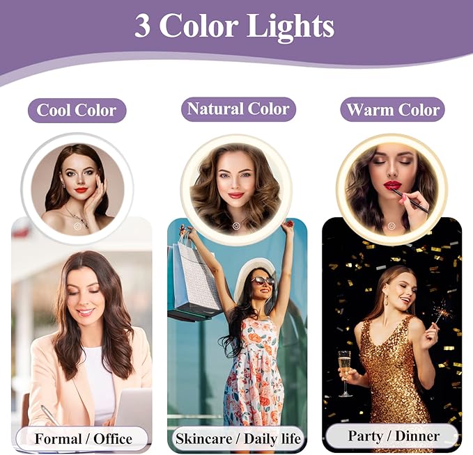- 【3 Color Lighting & Dimmable Touch Control】Equipped with bright LED lights, this magnifying mirror with light offers three lighting modes: white, warm, and natural. Tap the touch button to switch between modes, and long-press to adjust brightness (auto-off after 30 minutes of inactivity).
