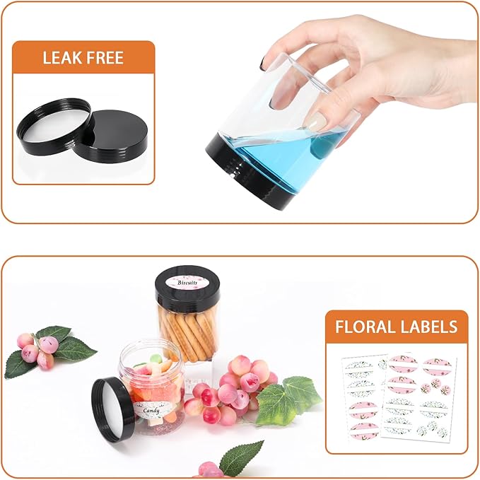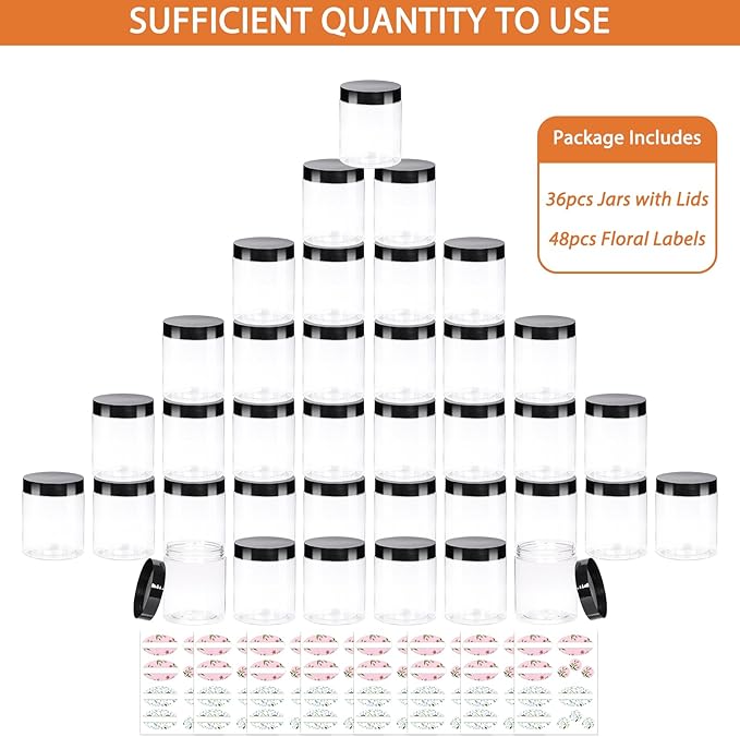 - REFILLABLE JARS WITH LIDS:Package include 36pcs 8oz/240ml empty refillable 8 oz plastic containers with lids and 48 Floral Labels. These 8oz plastic jars with lids are typically used for lotion, cream, serum, gel, putty, clay, hair products, skin products, cleanser, and other personal care products