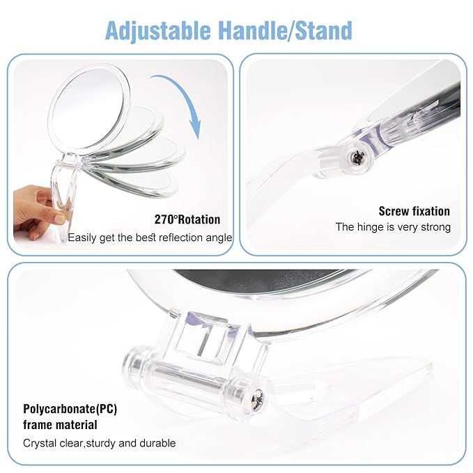 - Adjustable Handle / Stand - Mirror with the adjustable handle.The handle will fold on either side and easily converts 3 ways - handheld, hang, or fold into a stand,so that you can use it anywhere.