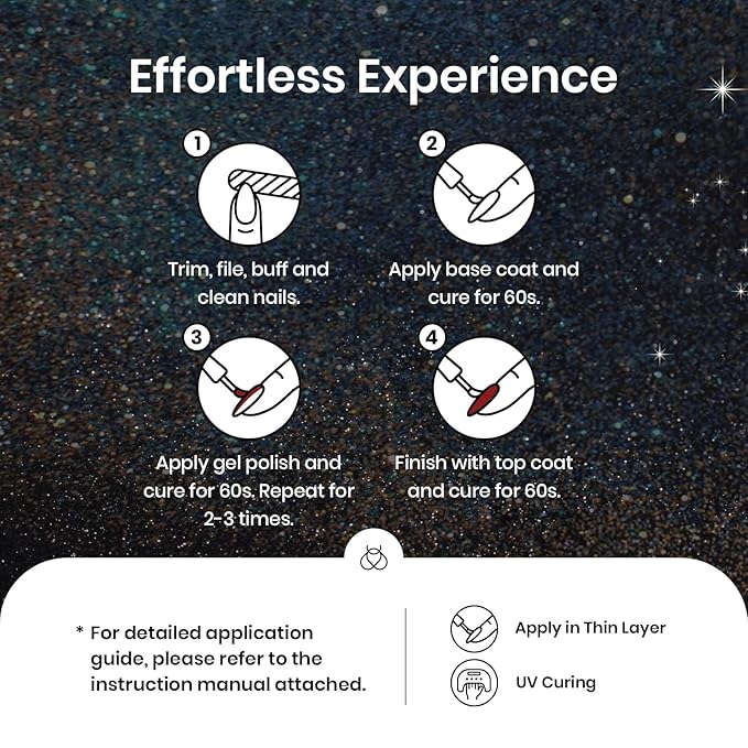 - Easy Application and Good Tenacity: The UV LED nail gel polish set lasts for 28+ days with perfect shine under proper application - With base gel top coat under the full application process. Please read the Product Description for more details.Tips: Gently shake well before use—especially for metallic, glitter, and cat eye gel nail polish—to evenly mix natural settling of pigment particles.