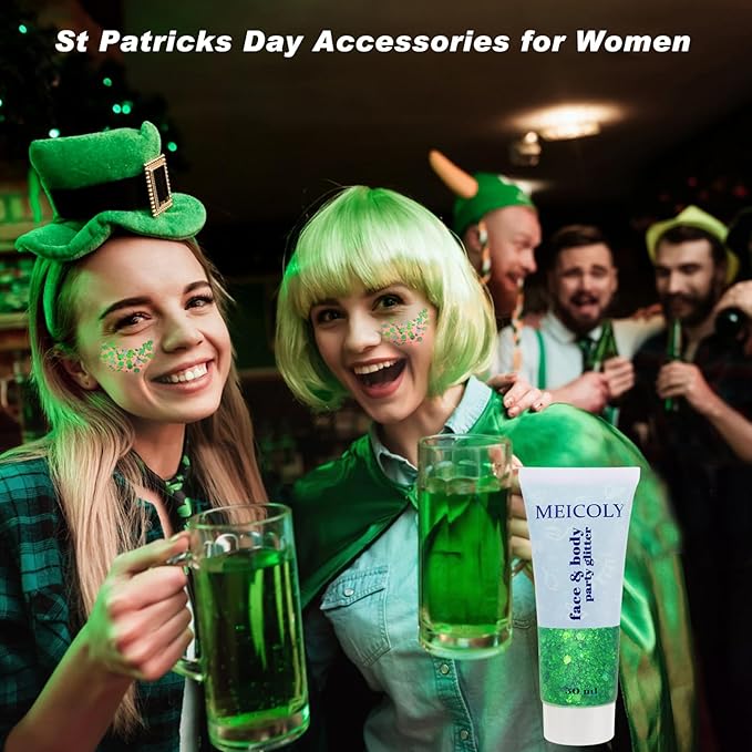 - St Patricks Day Face Glitter--- MEICOLY green face glitter is rich in green glitter sequins with different shape,the color and shine of the laser sequins vary with the perspective,great for st patricks day makeup,glitter makeup,Alien eye makeup and mardi gras carnival makeup,perfect st patricks day accessories for women.
