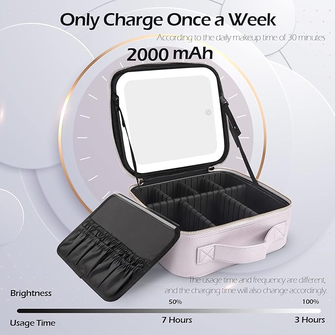 - đđ»ăMeticulous Selection of Materials, High Standard ProductionăDouble zippers of this lighted makeup case are controlled by high standards from chain cloth selection, sprocket arrangement, polishing, electroplating, and subsequent oil sealing and waxing processes to ensure smoother pulling. Specially customized sturdy plastic case for fixing the vanity mirror, whether it is placed in the luggage or directly on the car, the mirror surface will not break.