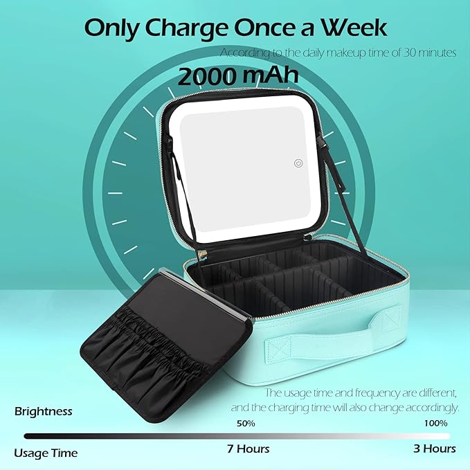 MOMIRA Travel Makeup Bag Cosmetic Bag Makeup Organizer Bag with Lighted Mirror, Adjustable Brightness in 3 Color Scenarios, Waterproof Makeup Train Case, Gift for Women - Aqua Blue