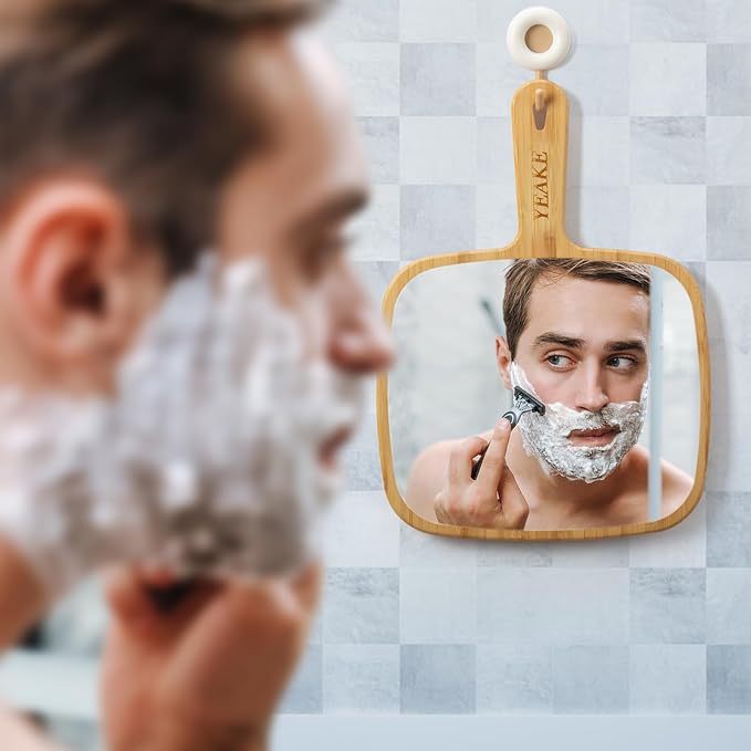 YEAKE Hand Mirror,Extra Large Natural Bamboo Handheld Mirror with Handle, Single-Sided Portable Travel Vanity Mirror for Men & Women,8.9" W x 12.4" L