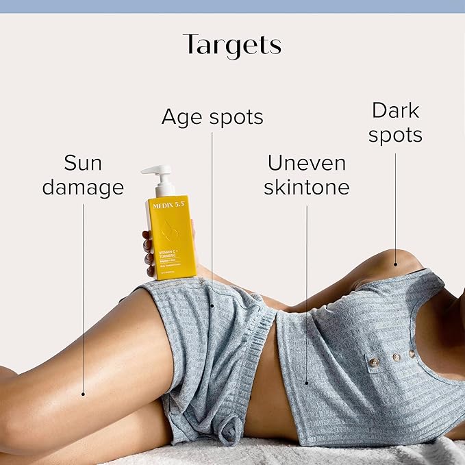 - EFFECTIVE INGREDIENTS β Medix 5.5 Vitamin C Cream Brighten + Firm Body Lotion is formulated with the perfect combination of effective brightening + anti aging ingredients, including Shea Butter, Aloe Vera, Ferulic Acid, Turmeric, Vitamin E, Glycerin, Ginger, & More. Shea Butter deeply moisturizes the skin, improves elasticity, & provides a protective barrier to help prevent moisture loss. Vitamin E helps protect skin against free radicals + UV Damage. Aloe Vera helps calm + hydrate the skin.
