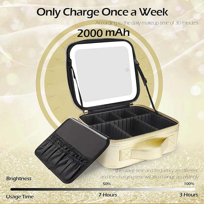 MOMIRA Travel Makeup Bag Cosmetic Bag Makeup Organizer Bag with Lighted Mirror, Adjustable Brightness in 3 Color Scenarios, Waterproof Makeup Train Case, Gift for Women - Golden