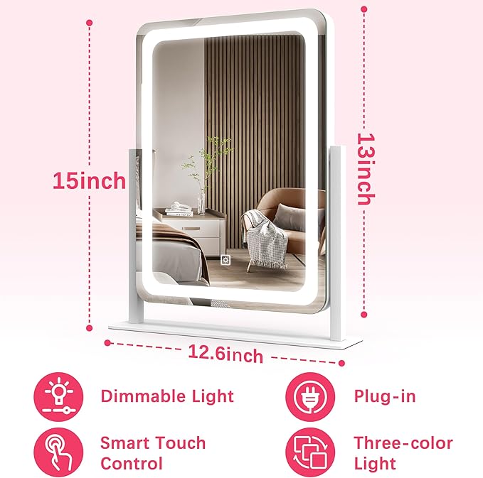 Vanity Mirror with Lights, 12.6"×15" LED Makeup Mirror, Lighted Makeup Mirror with Lights, Smart Touch Control Dimmable 3 Modes Light, Lighted Up Mirror for Makeup Desk, Bedroom, Dressing Room