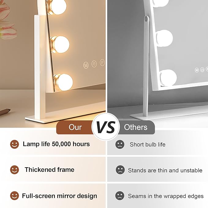 - 【Sturdy Build, High Quality LED Bulbs】Made with a solid metal frame and base, our makeup mirror with lights is built to last and can withstand heavy use. The top-quality materials ensure that the reflective surface is superior, bulbs boast a lifespan of up to 50,000 hours.