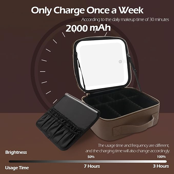 MOMIRA Travel Makeup Bag Cosmetic Bag Makeup Organizer Bag with Lighted Mirror, Adjustable Brightness in 3 Color Scenarios, Waterproof Makeup Train Case, Gift for Women - Brown