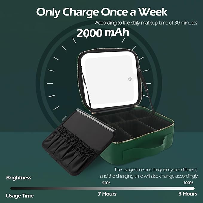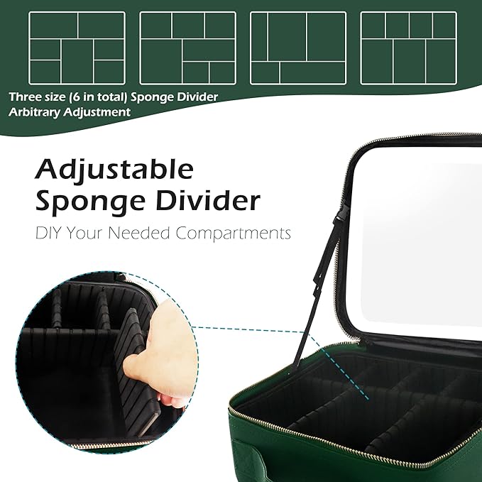 MOMIRA Travel Makeup Bag Cosmetic Bag Makeup Organizer Bag with Lighted Mirror, Adjustable Brightness in 3 Color Scenarios, Waterproof Makeup Train Case, Gift for Women - Emerald Green