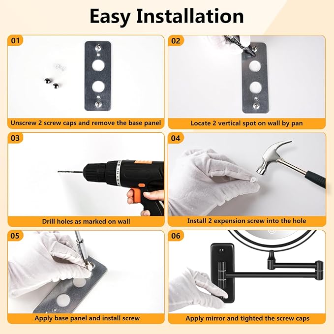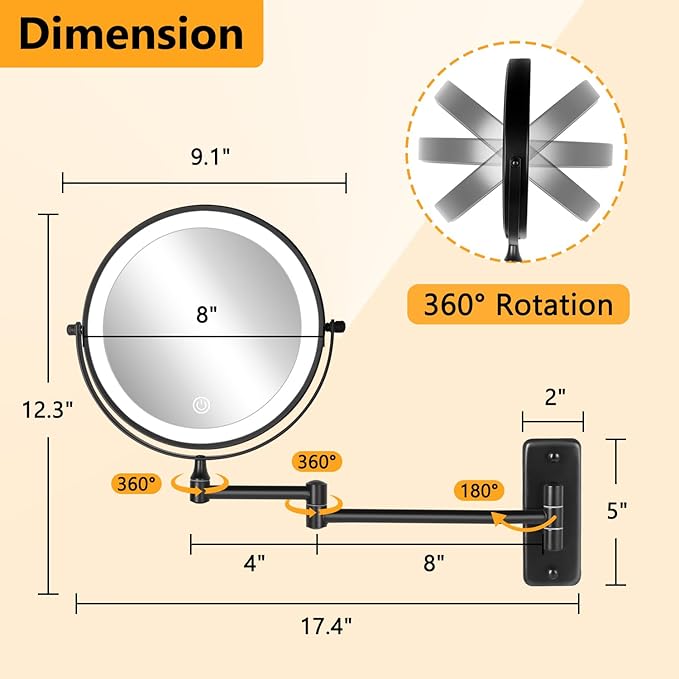 - 360° Swivel Extendable Mirror - This magnifying mirror with light designed with extendable arm allows 360°rotation, so that you can find your comfort viewing angle to meet your needs in the bathroom for makeup, shaving and wearing contact lenses etc. The bathroom mirror for wall can be folded against the wall to save space when not in use.