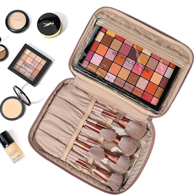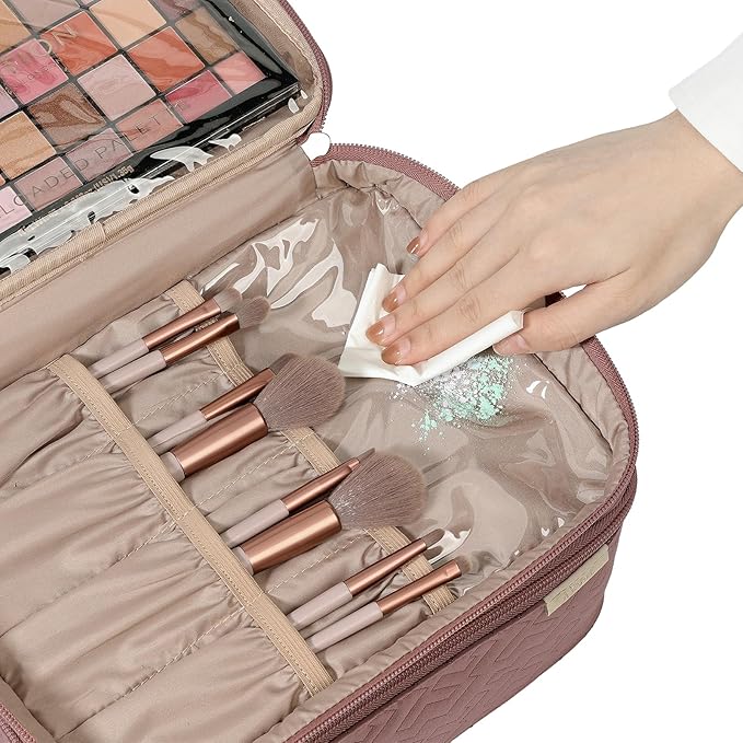 - HOLDS SUBSTANTIAL MAKEUP BRUSHES - There are eight brush slip pockets on the top compartment to fit different sizes of brushes. The clear plastic lining provides an easy-to-clean surface