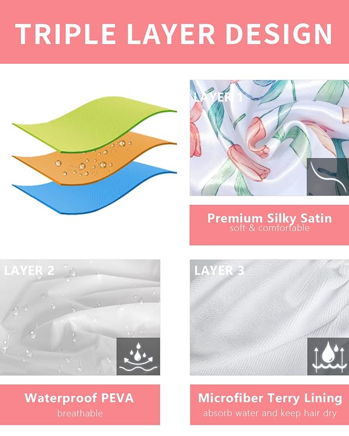 - 【TRIPLE-LAYER DESIGN】:Our waterproof shower caps are made with a soft satin fabric, waterproof EVA cloth, and terry cloth for extra absorption. Say goodbye to soggy hair