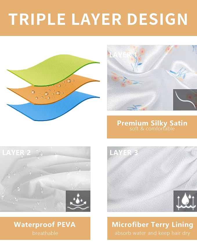 - 【TRIPLE-LAYER DESIGN】Our waterproof shower caps are made with a soft satin fabric, waterproof EVA cloth, and terry cloth for extra absorption. Say goodbye to soggy hair