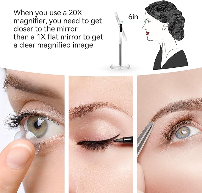 - 20X MAGNIFICATION MIRROR: The 20x magnifying mirror works great for touch-ups, details and other beauty treatments. Makeup mirror 20x helps you to make precise makeup applications, such as applying contact lenses and tweezing facial hair & eyebrow, also ensures no more awkward blending or mini flaws