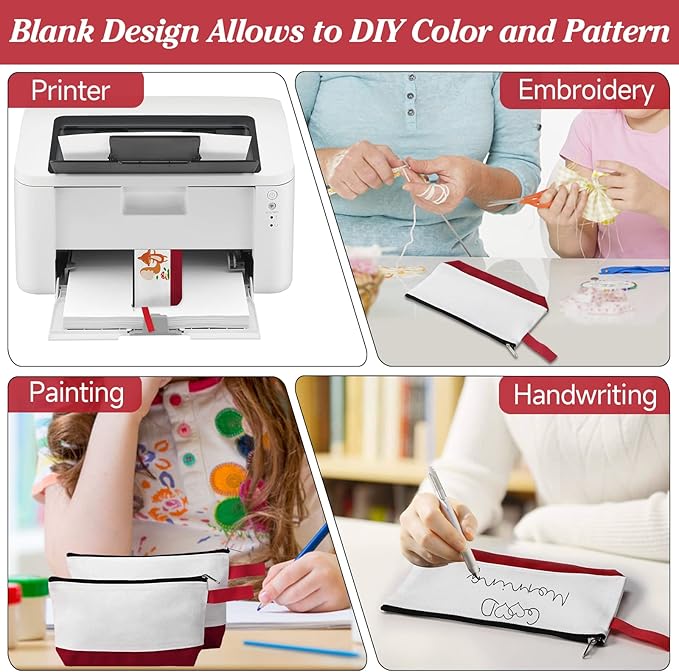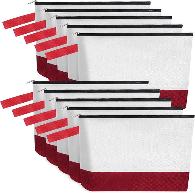10 Pieces Cotton Canvas Makeup Bag with Bottom and Strap, Multi-Purpose Cosmetic Bag with Zipper Travel Toiletry Pouch, Blank DIY Craft Bag (White&Red, L)