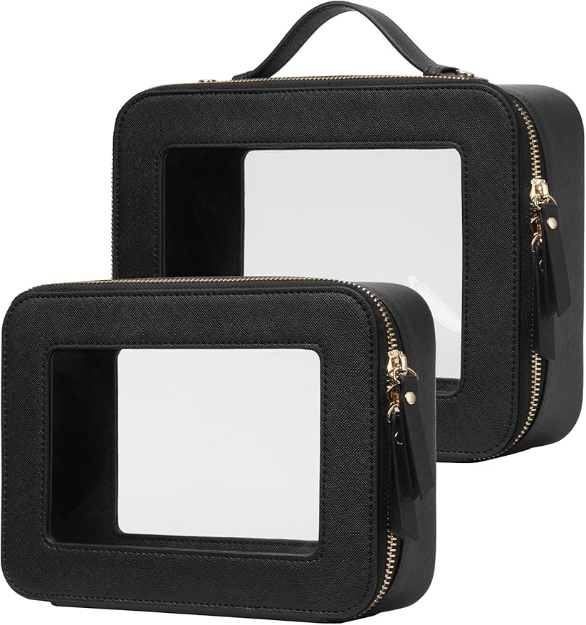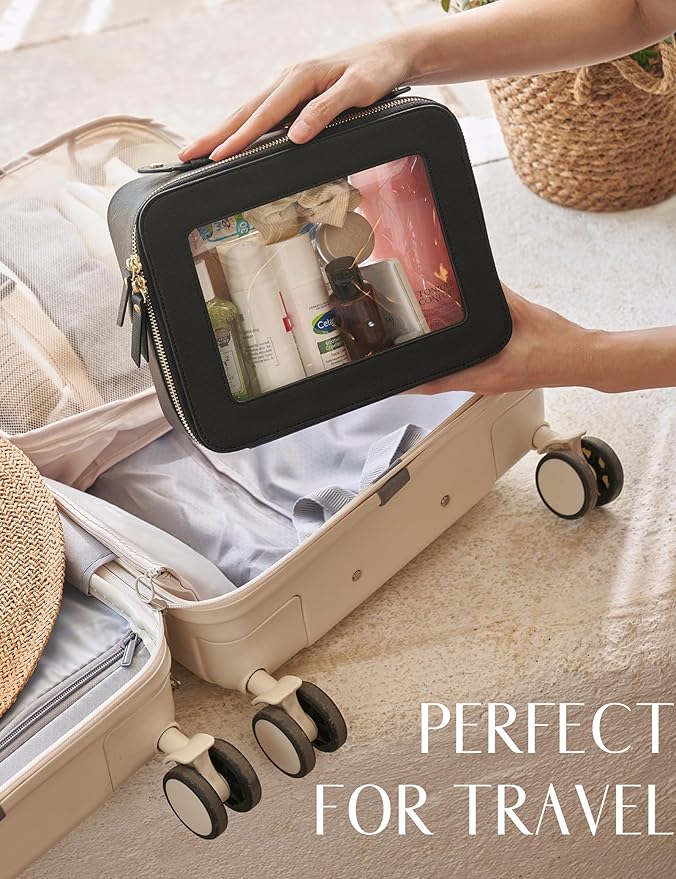 • [Premium Material and Durability] – The clear cosmetic case, both the exterior and interior, is crafted from high-grade saffiano faux leather, which is highly scratch resistant, durable and exceptionally easy to keep clean. It features a smooth zipper for secure closure, and elegant light gold metal hardware accents, adding a luxurious and sophisticated touch to the bag's overall design.