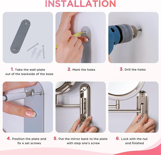 - 【Easy to Install】All installation accessories and instructions come with the wall-mounted mirrors in the package. The makeup mirror wall mounted is easy to install, anyone can install it in 5 minutes.