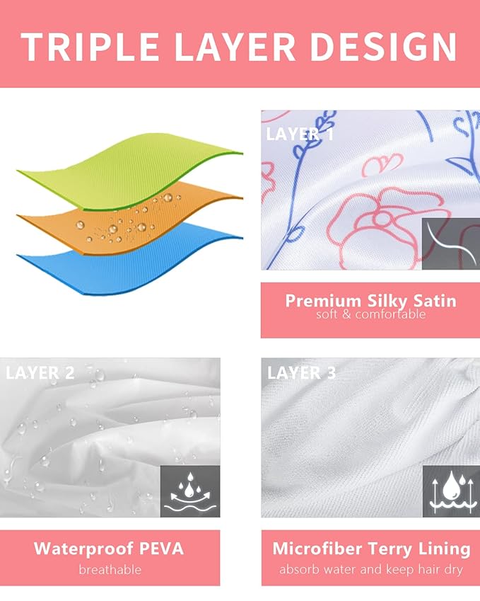 - 【TRIPLE-LAYER DESIGN】Our waterproof shower caps are made with a soft satin fabric, waterproof EVA cloth, and terry cloth for extra absorption. Say goodbye to soggy hair