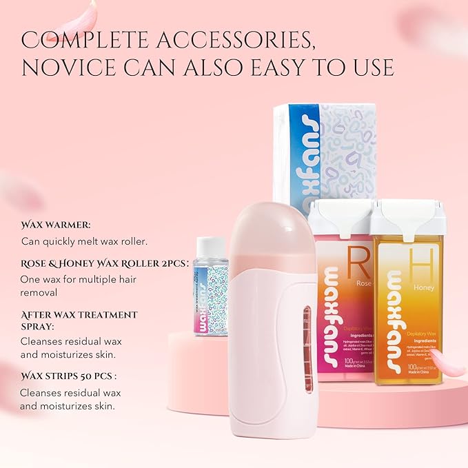 Roll-on Waxing Kit for Hair Removal - At-Home Wax Warmer, Easy Rolling Applicator for Women, Honey & Rose Fragrance