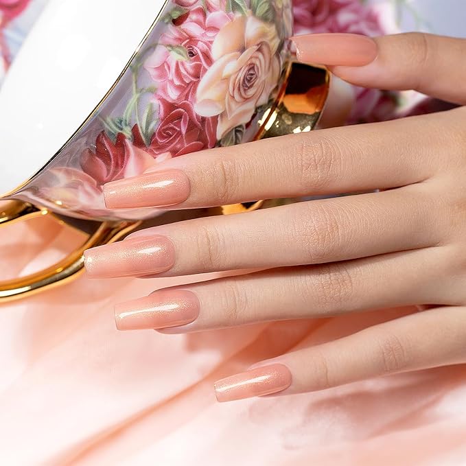 - SHIMMER NUDE GEL POLISH:Nude nails always bring natural and pure beauty to all ages and glitter gel nail polish is 1 of the most stylish ways to wear this trend. The nude-toned color is littered with gold glitter that reflects and twinkles no matter where the light catches the nail