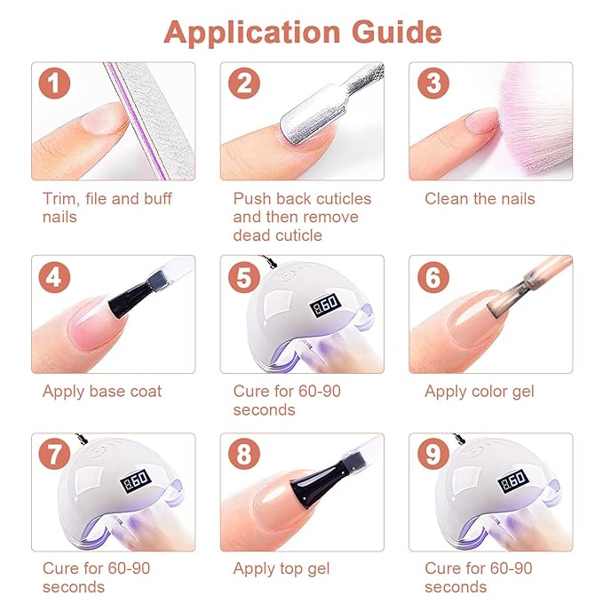 - SALON QUALITY HOME USED:Glitter nude gel nail polish is a good choice for use in a nail salon or nail starter at home. You can design your own manicure at home to show your style. Remember the gel polish needs to be cured under LED or UV nail lamp. The average for Nail lamps is 60-120 secs