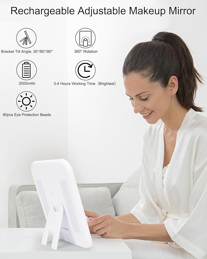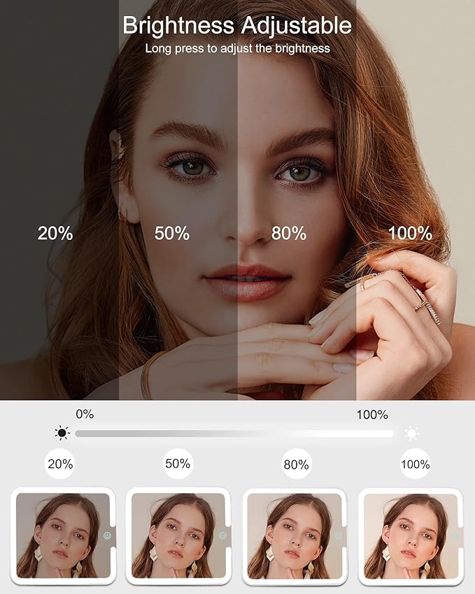 - Makeup Mirror with 3 Color Lights: The makeup bag with a rechargeable lighted makeup mirror, 3 Color Lights, and Brightness adjustment. providing white light, warm light, and cold light. Short press the sensor switch to change the color of the light, and long press to adjust the brightness of the light. Size 10.3'' x 9''x 4.7'' ((L x W x H).