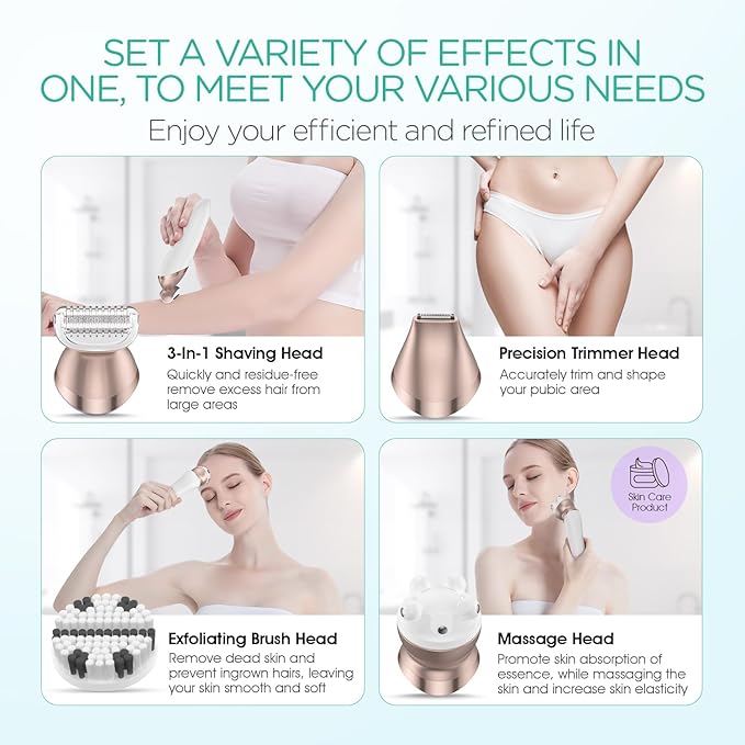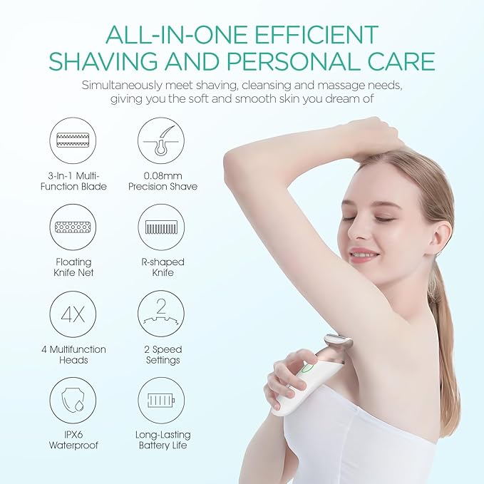 - 4-in-1 Multifunctional Grooming Kit - Equipped with 4 multi-functional replaceable heads, including 3-in-1 shaving head, precision trimming head, massage head and exfoliating brush head, this razors for women can help you soothe and clean while shaving, and provide your skin with more comprehensive care