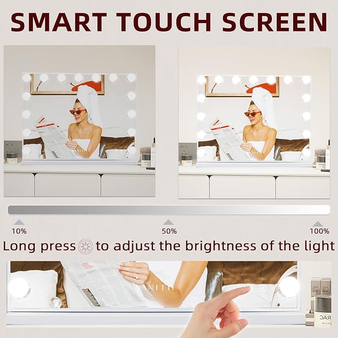 - ADJUSTABLE BRIGHTNESS AND 3 LIGHT MODES: The smart vanity mirror is surrounded by 15 bulbs, and the touch screen design of the light up mirror allows you to adjust the light brightness from 0% to 100%, you can also change 3 colors of the light