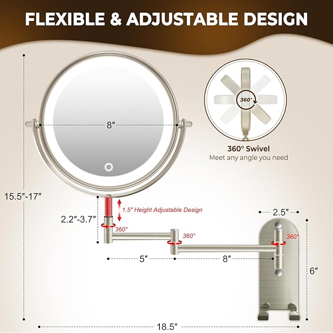 - â¨ăHeight Adjustable Extension Armăâ The height of the bathroom vanity mirror is adjustable from 15.5" to 17" to meet varying height requirements; âĄ360°free rotation allows you to effortlessly find your desired angle; ⢠The wall mounted mirror with 13" extendable arm can be adjusted to any position you need to achieve perfect viewing. The cosmetic mirror has passed over 20,000 times fatigue test, proved the durability and stability of the rotating shaft.