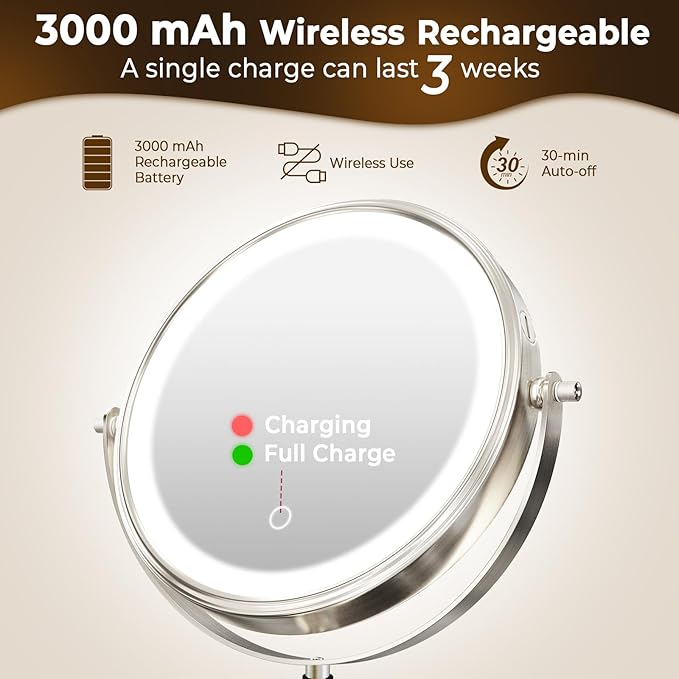 - đă3000mAh Built-in Rechargeable Wireless UseăCONLWIN lighted makeup mirror is equipped with a 3000mAh rechargeable battery, providing 10-15 hours of wireless usage at different brightness levels. Its type-C charging port offers high efficiency (includes USB cable), the charging port remains stable even after 18,000 repeated charges. This wall mounted mirror has an auto-shutoff feature after 30 minutes to save power if you forget to turn it off.