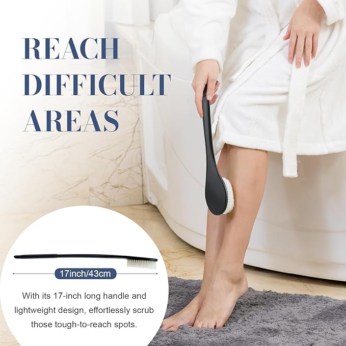 - EXTENED LENGTH OF REACH: To cater to its multi-functional role as a back brush for showering, we've upgraded the handle length to 17 inches, allowing you to effortlessly cover hard-to-reach areas like your back, lower legs, and feet without bending over. This feature proves particularly valuable for individuals with limited shoulder mobility or difficulty in bending their waist. Additionally, its slight curvature enhances ease of use with every stroke.
