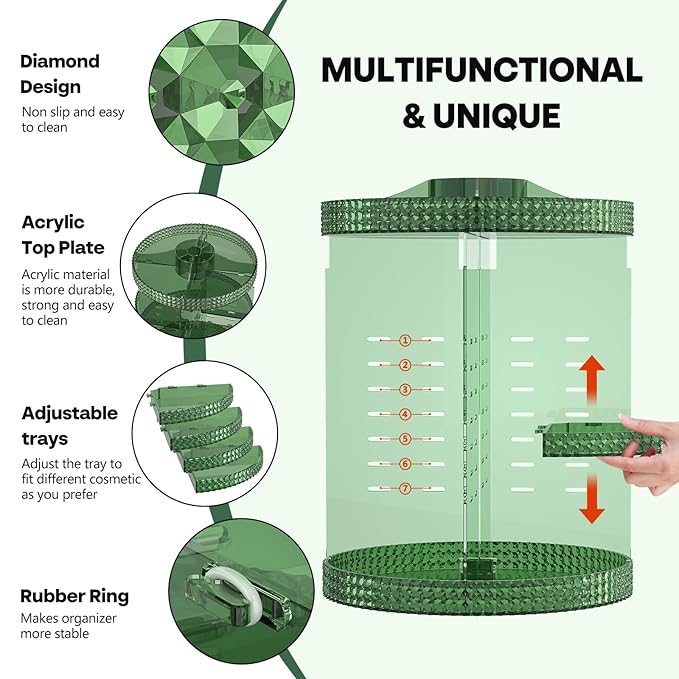 360 Degree Rotating Makeup Organizer for Vanity, Large Capacity Beauty Organizer, Adjustable DIY 7 Layers Perfume Organizer, Skincare Organizers Fits Cosmetics and Accessories(Emerald Green)