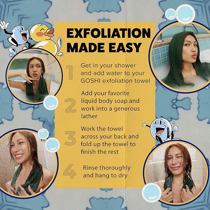 - Exfoliation Made Easy: Get ready to feel the softest and cleanest you’ve ever been. The GOSHI exfoliating towel is a game-changing Japanese shower towel and body scrubber exfoliator with more substantial surface area coverage, allowing you to clean hard-to-reach areas without the cumbersome parts that can ruin your entire shower experience. The perfect replacement for your loofah, glove, scrub brush, and even your old towel brand.