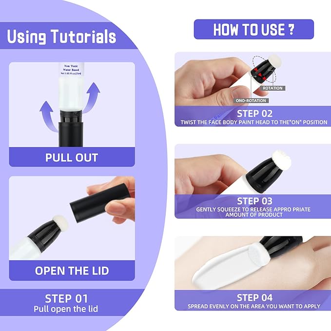 - 【Water Based Safe Formula】Made of non-toxic,water based safe ingredients.It is hypoallergenic. Suitable for all kinds of skins.High pigment face paint provides enough to cover full skin .Note:Our face paint is not Waterproof(Don’t body paint when it’s raining out).
