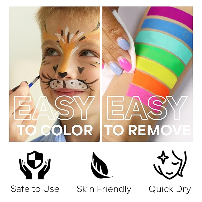 - 【Smudge-proof & Easy To Remove】The pigment is not easy to fade after drying and ensures that your face body paint will not be stained by sweat. And you only need to use soapy water or makeup remover to clean it.