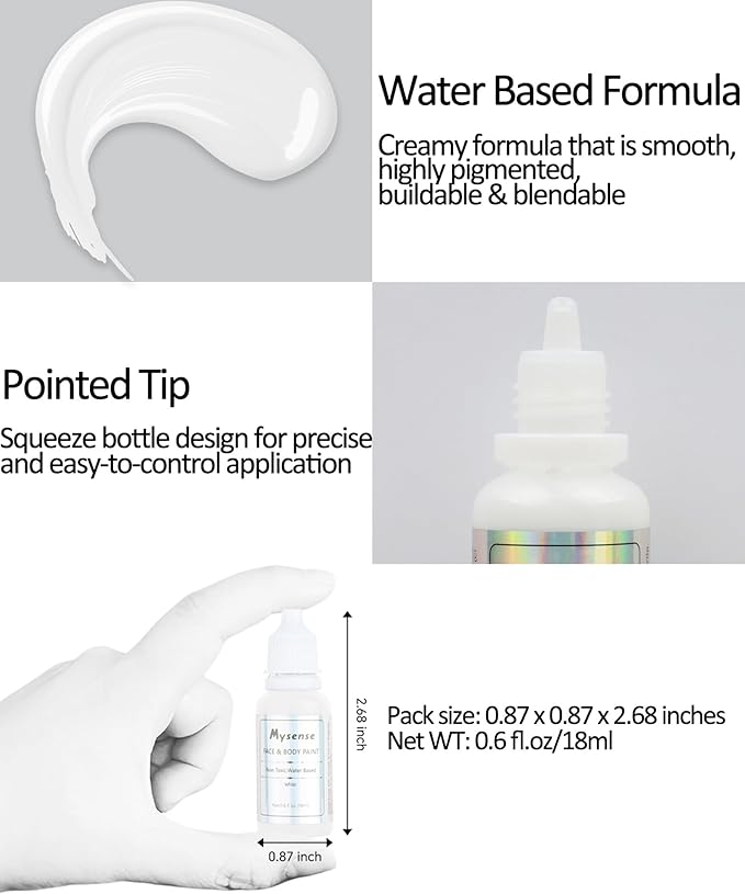 - Precise Application --- The pointed tip squeeze bottle design of this face and body paint allows for controlled and precise application,making it perfect for intricate designs for any body painting makeup