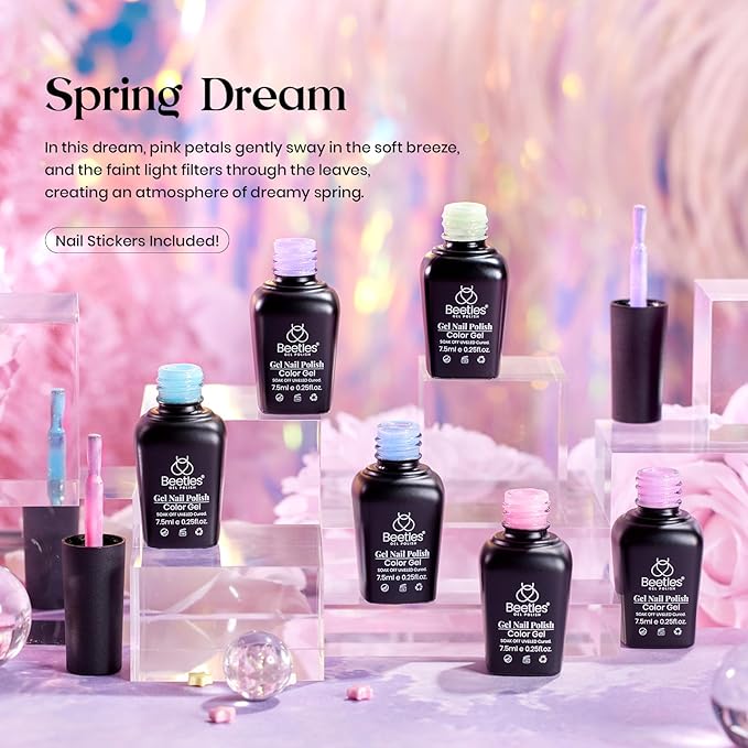 - Beetles 2024 Spring Dreaming Gel Polish Set: The package includes 6 colors 7.5ML/ 0.25fl oz gel polish with butterfly stickers. This is all-in-1 shimmer valentines day nail polish set, in this dream, pink petals gently sway in the soft breeze and the leaves creating an atmosphere of dreamy spring. Enjoy your Garden Manicure Art. Color Number: d924-d923-d922-d921-d920-d919