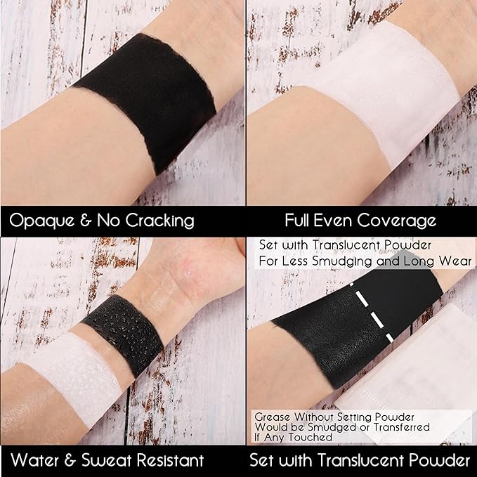 - 💗HIGH PIGMENTED & WATERPROOF - All face paint colors are excellent full coverage with flawless, only takes one pass to fully cover the skin, highly pigment and waterproof, sweat-proof. As with any professional grease cream makeup, it NEVER DRIES OUT completely like water-activated paint. We highly recommend to seal it with translucent powder to make it get long wear and less transferring and smudging, help last hours at a hot convention.