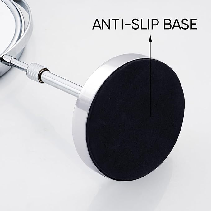 - 360 Degrees Free Rotation¦Swivel freely and fix well at any angle as you like. Made of high quality and shiny metal. Polished chrome finish guarantees the smoothness and the glossiness. The make-up mirror face is 8 inches large which has a wider range of view than 6 inch make-up mirror.