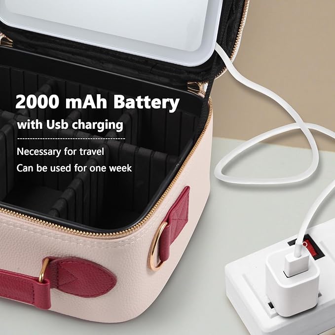 - 【Stunning Portable Dresser】The cosmetic bag perfectly combines GERYUAEG's unique design with many advantages of similar products on the market. Large makeup storage space(10.4 "x 9.5 "x 4.7"), 10 makeup brush pockets, 4K silver-plated cosmetic mirror, 3 lighting modes adjustable fill light, adjustable DIY dividers, 2000 mAh more efficient battery ensures 8 days of continuous use, high quality PU leather shoulder strap and more. A great companion for traveling and business trips
